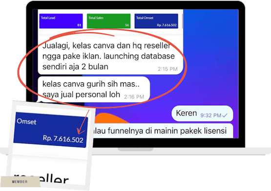 Dan ini salah satu member saya yang lain, jualan template canva dan kelasnya juga. Baru jualan ke membernya doang dengan lisensi paling murah, dapet 7 jutaan udah enak banget!