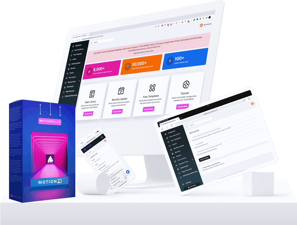 Cukup isi data Anda saja, Anda bisa melakukan rebranding dashboard library milik MOTIONFX.ID sehingga customer Anda tidak melihat branding orang lain, hanya branding Anda saja
